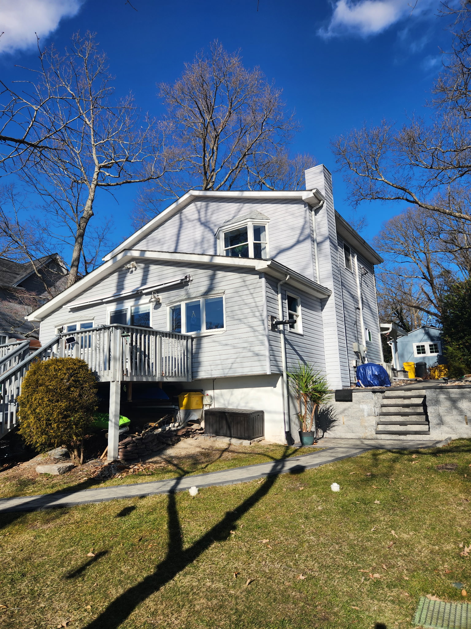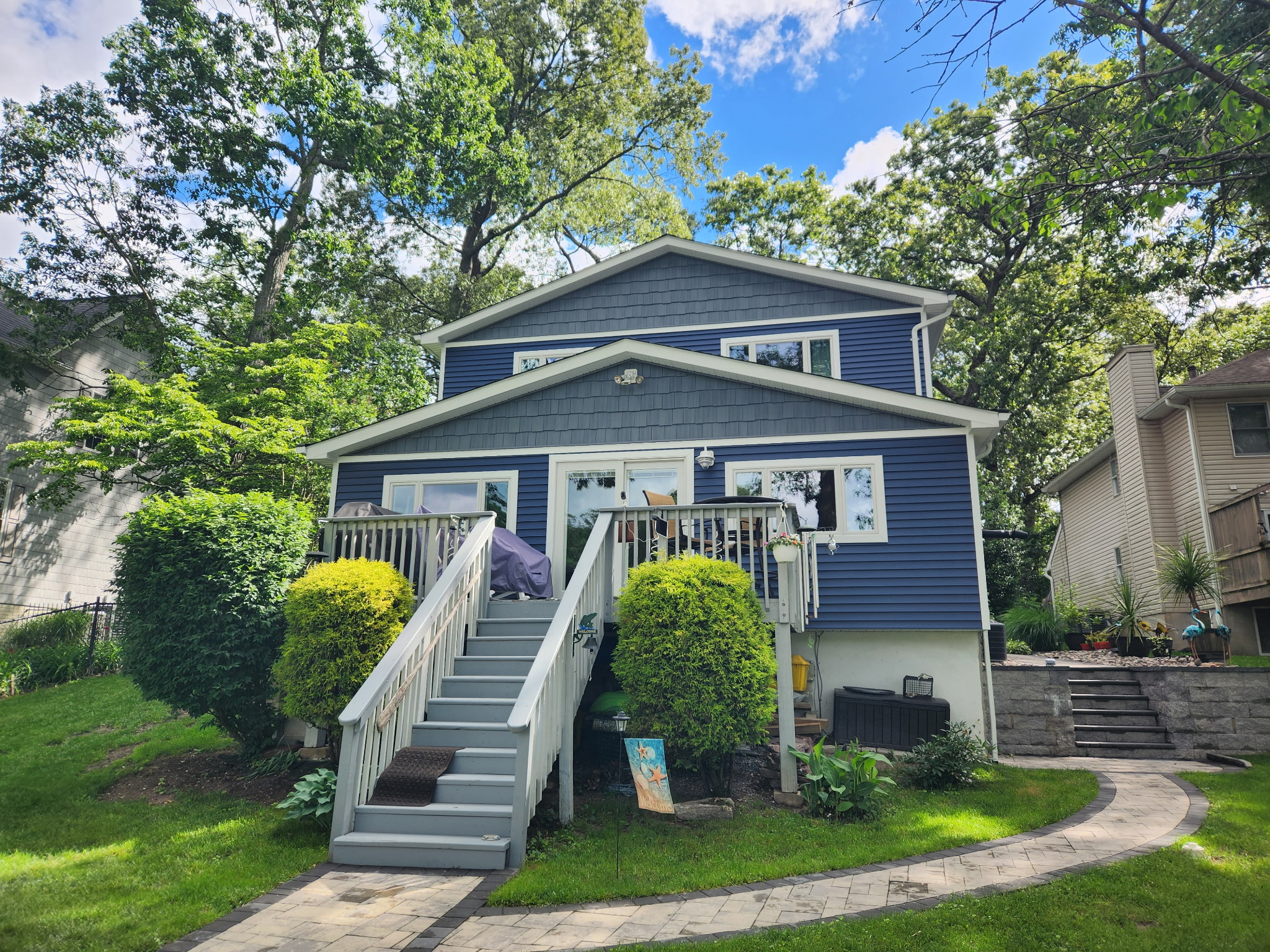 Next, we replaced the siding with CertainTeed vinyl siding in a Midnight Blue color. This bold yet timeless shade created a striking contrast and added depth to the home’s exterior. The new siding delivers low-maintenance performance while protecting the home from moisture and everyday wear.